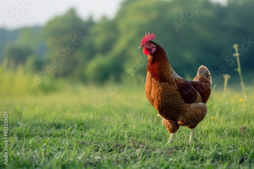 View from side body of a Rhode Island Red standing on grass, Awe-inspiring, Full body shot ::2 Side Angle View