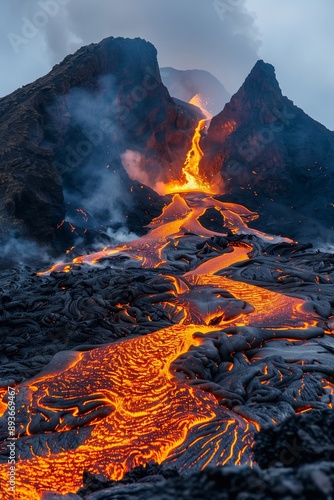 view, volcanic, eruption, lava, flow, smoke, island, background, magma, crater, hot, beautiful, travel, natural, nature, landscape, mountain, big, molten, activity, form, high, splashing, igneous, fiery, active, geology, danger, volcano, coast, explosion, steam, heat, peak, basalt, shape, sea, scenic