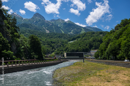 view, caucasia, western, caucasian, mount, mountain, krasnodar, russia, tour tourism, nature, natural, landscape, scene, scenery, massif, traveling, travel, european, europa, slope, rock, stone, cliff, cloud, panorama, panoramic, tree, green, summer, resort, house, building, sochi, red, glade, river, water, vale