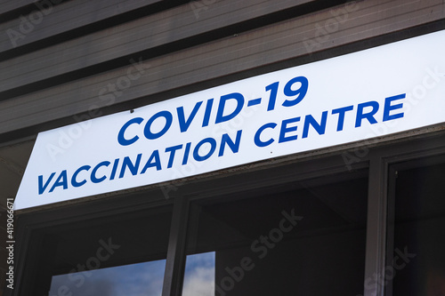 View of entrance building with sign Covid-19 Vaccination Centre in Nanaimo, Canada