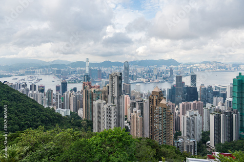 View of Hong Kong and Kowloon from Victoria peak. Panorama of Hong Kong, skyscrapers and nature. 21 May 2025, Hong Kong, China