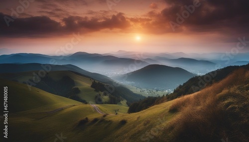 view of misty mountain layers and sunset from a high hill