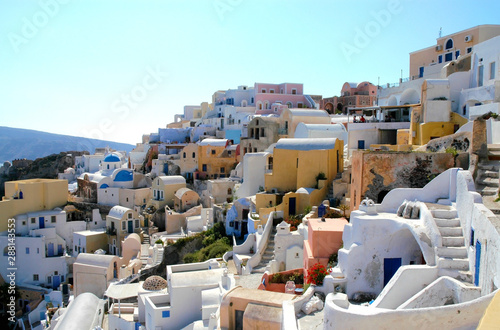 View of Oia, Santorini, Greece with colorful traditional houses. Santorini is famous for its colorful houses. Santorini colors are blue, white and yellow. Oia, Santorini, blue, white, yellow houses.