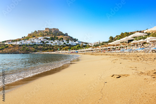 View of sandy beach in Bay of Lindos, Acropolis in background (Rhodes, Greece)