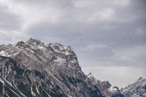 View of snowy alpine mountain landscape.