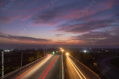 View of streaks of red and yellow light painting the motorway under a twilight sky, creating a captivating scene of motion and color, Islamabad, Pakistan.
