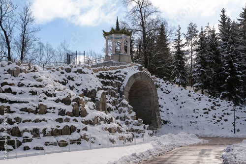 View of the arch "Big Caprice" over the Podkaprizovaya road in the Alexander Park of Tsarskoye Selo on a sunny winter day, Pushkin, St. Petersburg, Russia