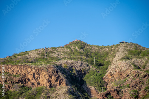 View of the Diamond Head lookout point from insider the volcanic crater.