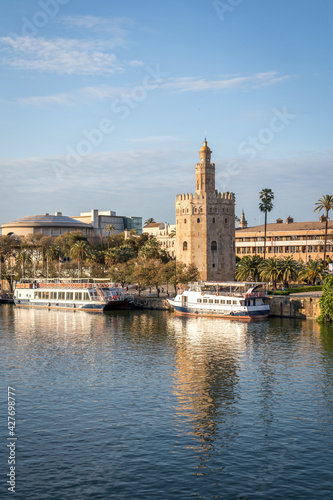 View of the Guadalquivir river and the Torre del Oro in Seville Spain. Typical postcard of the city. Vertical view.