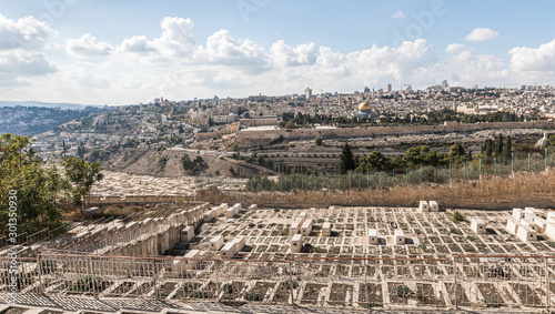 View of the Jewish cemetery, the Temple Mount, the old and modern city of Jerusalem from Mount Eleon - Mount of Olives in East Jerusalem in Israel