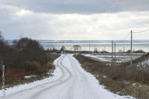 road, winter, lake, cloud, cloudscape, cloudy, daytime, grass, hill, landscape, nature, russia, snow, sun, travel, view, water