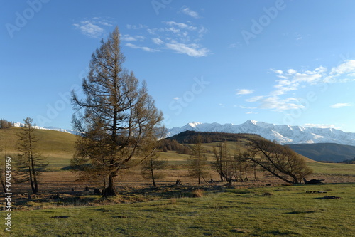 View of the North Chui mountain snow-covered ridge from the Kurai steppe. Gorny Altai, Kosh-Agachsky district, Russia