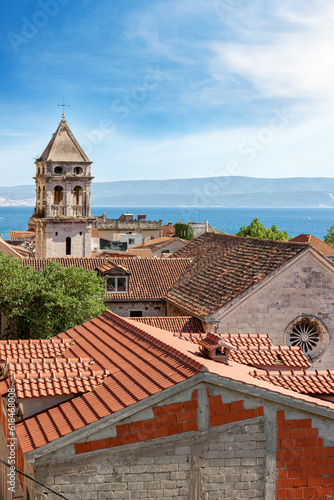View of the red roofs of the historic centre of Omis Croatia. The bell tower, Omis