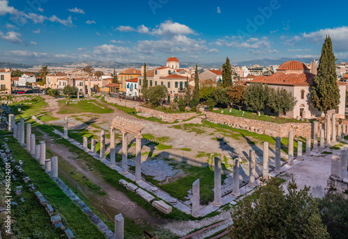 View of the Roman Agora in Athens, built during the Roman period, with the Fethiye Mosque on the right and neoclassical buildings in the background. Athens, Greece, December 2018.