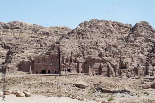 View of the Royal Tombs amidst the magnificent ruins of ancient Petra, located in Wadi Mousa, the Valley of Moses, in southwestern Jordan