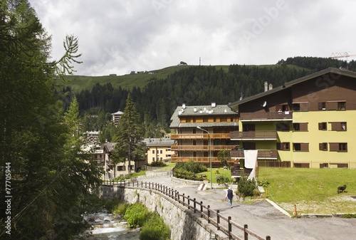 summer, mountain, sunny, chalet, building, river, alps, street, person, walk, tree, green, italy