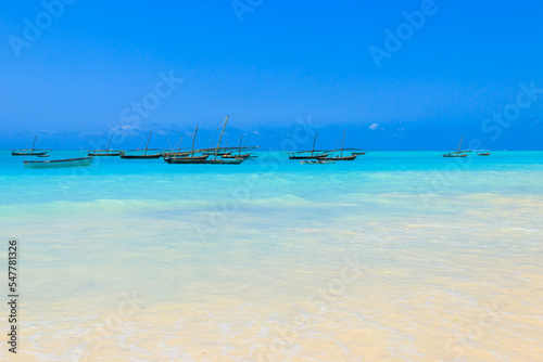 View of tropical sandy Nungwi beach and traditional wooden dhow boats in the Indian ocean on Zanzibar, Tanzania