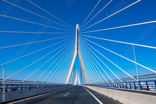 View on cable-stayed bridge with high pylons across the Bay of Cadiz, linking Cadiz with Puerto Real in mainland Spain
