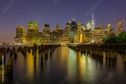View on skyscrapers in lower Manhattan from Brooklyn skyline in New York City at night.