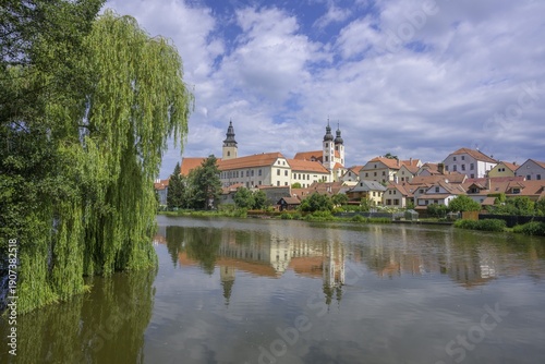View over a pond to the old town of, Telč, Kraj Vysočina, Czech Republic