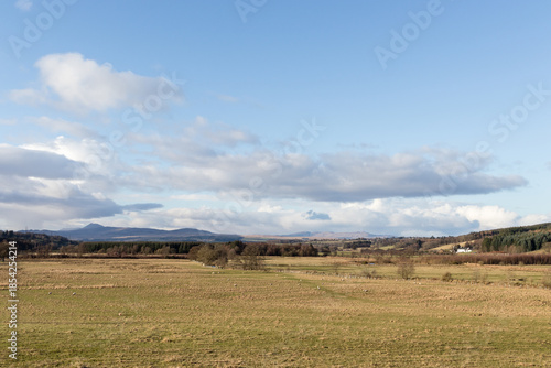 blue skies, countryside, environment, farmland, field, grass, hill, land, landscape, mountain, nature, rural, scenery, scotland, sheep, sunny, terrain, tree, vale, view