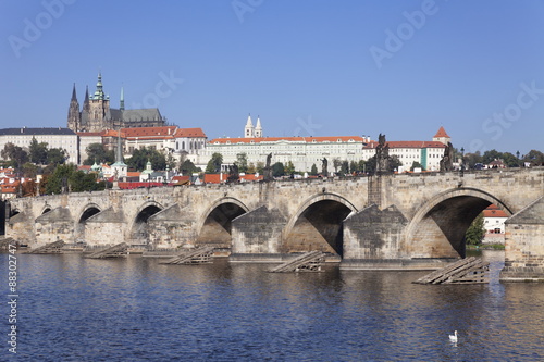 View over the River Vltava to Charles Bridge and the Castle District with St. Vitus Cathedral and Royal Palace, Prague, Bohemia, Czech Republic