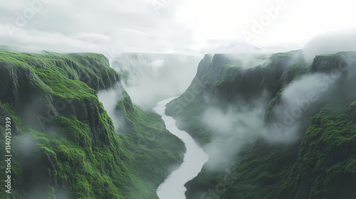 View river flowing valley fog iceland landscape green inspiring evokes delight plumbing jungle manicured garden stunningly fairy huge chasm. Chasm. Illustration
