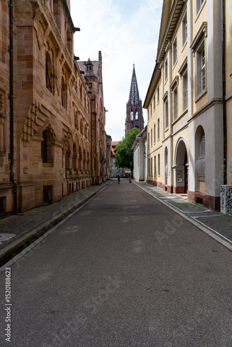 freiburg, minster, church steeple, cathedral, church, gothic, architecture, street, historic, german, city, urban, landscape, building, stone, yellow, mediaeval, european, travel, tour tourism, landmark, view, towering, ancient, heritage, sky, sunny, daytime, nobody, pathway, alley