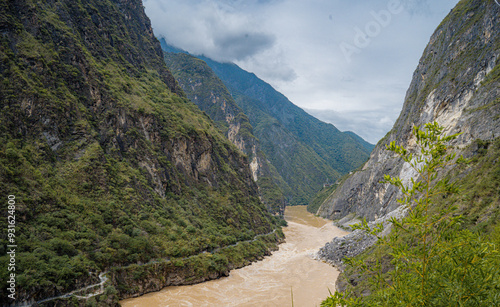 View to the steep valley of Tiger Leaping Gorge with meandering Yangtze River below in the summer of Yunnan, China.