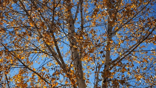 View to tree top of birch with brown leaves at sunny autumn day. Branches with lush foliage gently swaying in wind at parkland. Beautiful colorful fall season. Slow motion