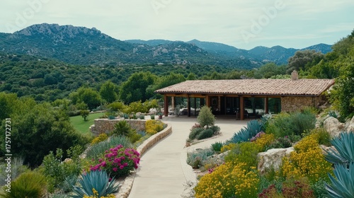 Villa nestled in a mountainous landscape: The image portrays a scenic villa in an environment that seamlessly blends natural beauty and architectural elegance.