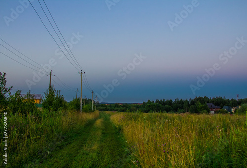 village, sky, field, sunset, line, russia, tower, moscow region, evening, countryside, wire, industry, high, nature, blue, grass, landscape, electrical, green, pole, powerline, meadow, steel, transmission
