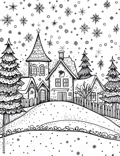 Villaggio invernale con accoglienti cottage, alberi di Natale e stelle scintillanti. Illustrazione in bianco e nero da colorare per adulti
