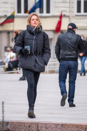 Vilnius, Lithuania - March 28 2021: Beautiful blond girl without mask walking in the city during Covid or Coronavirus restrictions, vertical