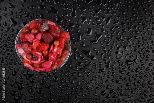 Vinaigrette salad in a glass bowl on a wet dark surface. Russian salad.