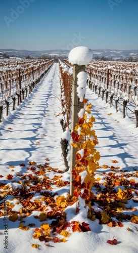 vinery, winter, snow, wine, grape, cold, frost, season, autumn, fall, leaf, landscape, nature, rural, agriculture, vine, row, glacé, chilly, weather, outdoors, scenic, countryside, latently, plant, tree, ground, white, blue, sky, clear, sunlight, contrast, colours, orange, red, yellow, brown, earth, field, horizon, perspective, path, alley, cultivation, vine-growing