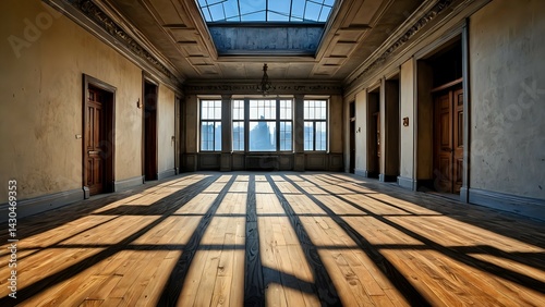 vintage, abandoned, hallway, sunlight, shadow, geometric, wooden floor, architecture, historic, old building, interior, atmospheric, moody, empty, roomy, window, structure, aged, classical, timeless, natural light, nostalgic, open space, rustic, forgotten, antique, retro, skylight, symmetry, heritage, derelict, storytelling, floor