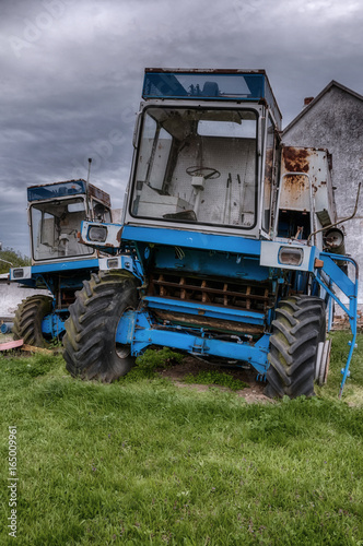 Vintage and rusty harvester machines in a backyard