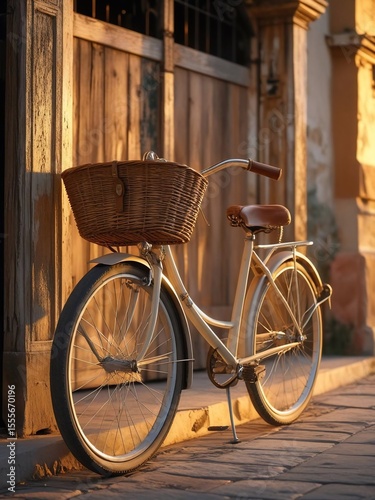 Vintage bicycle with a wicker basket bathed in golden hour light on an old street
