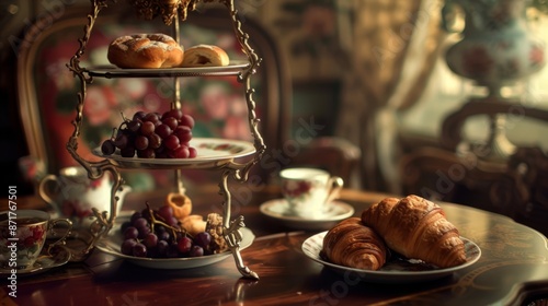 Vintage breakfast, on an oak table, cups of aromatic tea, crispy croissants, bunches of sweet grapes
