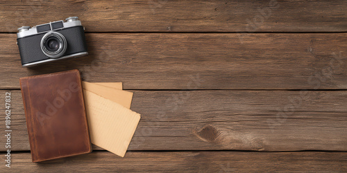 Vintage camera and leather notebook with aged paper on rustic wooden table, evoking nostalgic travel memories and classic style in warm tones