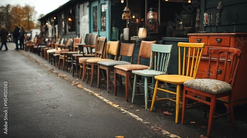 chair, vintage, market, furniture, antique, second hand, colourful, wooden, painted, street, display, sale, row, autumn, rain, city, people, shopping, brown, blue, yellow, red, green, orange, grey, rustic, reclaimed, shop, buying, selling, fall, wet, street scene, urban, street fair, crowd, old, second hand