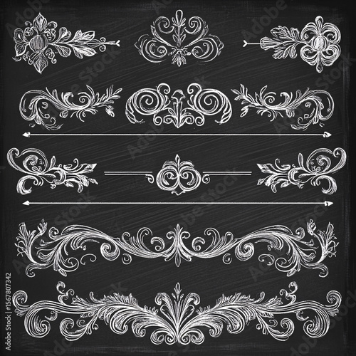 Vintage chalkboard decorative floral dividers and ornate hand-drawn flourishes in baroque and Victorian style