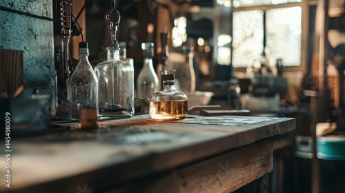 Vintage chemistry lab with glass bottles and wooden cabinets