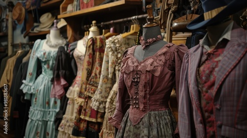 clothing, vintage, store, display, fashion, retro, apparel, mannequin, boutique, garment, hat, dress, suit, jacket, fabric, pattern, style, western, old, classic, rustic, antique, lace, frill, bow, buttons, detail, historical, retail, decor, design, collection, accessory, shades, shop, shelf, wooden, interior, pattern, textile
