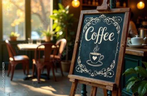Vintage coffee chalkboard with ornate lettering in cozy cafe