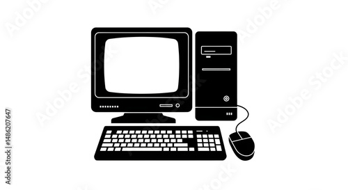 computer, desktop computer, monitor, screen, tower, keyboard, mouse, illustration, drawing, graphic, silhouette, technology, computing, digital, nostalgia, old-fashioned, obsolete, electronic, device, equipment, past, history, personal computer, simple, retro, vintage, black-and-white, high contrast, minimalist, black, white, blank screen