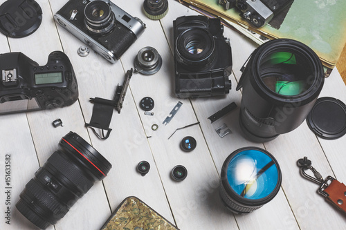Vintage film cameras, their components, modern digital cameras and lenses on wooden white background technology development concept