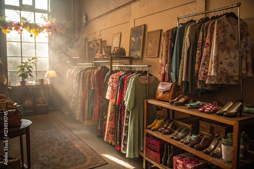 floral pattern, clothing store, boutique, retail, display, rack, organised, cosy, nostalgic, charming, rustic, old-fashioned, antique, second hand, still life, shopping, treasure hunt, bargain, deal, discover, explore, find, shoe shop