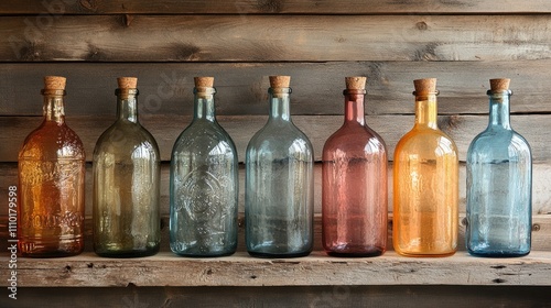 Vintage glass bottles in various colors arranged on a wooden shelf against a rustic wooden background.